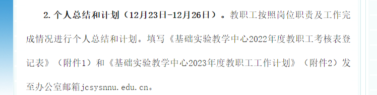 根据学校人力资源部《关于2022年度教职工考核工作安排的通知》要求,现将2022年中心教职工年度考核工作安排如下: 一、考核组织 在学校教职工考核领导小组统一领导下,中心成立考核工作领导小组,具体负责教职工的年度考核工作,人员由中心班子成员、纪检委员、工会主席、专业负责人组成。 二、考核对象 中心全体在编在岗人员(处级干部考核工作由学校党委组织部组织实施)。 三、考核内容 教职工年度考核以学校确定的基本岗位职责和中心的工作任务为依据,考核内容包括德、绩、能、勤、廉五个方面,考核的重点是工作实际和育人实际。 德:主要考核教职工的政治素养、思想觉悟、个人品德以及遵守社会公德、职业道德、家庭美德等情况。所占分值为20分。 绩:主要考核教职工在本职岗位上做出的实绩和对学校事业发展做出的贡献等情况。所占分值为50分。 能:主要考核教职工的专业知识和业务技能满足岗位工作需要及自我教育、继续教育等情况。所占分值为10分。 勤:主要考核教职工的工作态度、敬业精神和遵守劳动纪律等情况。所占分值为10分。 廉:主要考核教职工廉洁奉公、廉洁自律等情况。所占分值为10分。 年度考核总分90-100分为优秀;70-89分为合格;60-69分为基本合格;60分以下为不合格;不确定考核档次人员不赋分。 四、考核程序 1.安排部署(12月23日)。根据学校教职工年度考核安排,中心组织教职工学习考核文件。 2.个人总结和计划(12月23日-12月26日)。教职工按照岗位职责及工作完成情况进行个人总结和计划。填写《换妻 2022年度教职工考核表登记表》(附件1)和《换妻 2023年度教职工工作计划》(附件2)发至办公室邮箱huanqi88.org。 3.考核测评(12月26日—12月29日)。各专业及办公室召开本专业或办公室推荐会议,依据教职工个人总结及日常工作情况推荐优秀等次;各教职工结合推荐情况、教职工个人总结及日常工作情况进行测评,填写《换妻 2022年度教职工考核测评表》(附件3),并发至办公室邮箱jcsy@huanqi88.org。 4.拟定结果(2022年12月29—2023年1月1日)。中心教职工考核工作领导小组综合考核测评、平时考核等综合评分,初步确定教职工年度考核结果。 5.单位公示(1月2—1月6日)。中心对初步确定的考核结果进行公示,公示期为5个工作日。 6.结果报送(1月6日后)。经中心党政联席会议研究,并经分管校领导同意。 中心通过人力资源管理系统年度管理考核模块,填报教职工“德、绩、能、勤、廉”五个方面的综合评价得分情况,经人力资源部初审后打印年度考核结果汇总表,由中心主任签字、加盖公章后报送人力资源部。对拟确定为基本合格、不合格档次的人员,中心同时报送相关材料。 五、有关要求 (一)提高认识,高度重视 对教职工进行年度考核是学校常规管理和人事分配制度改革的重要组成部分,考核结果作为教职工个人职务晋升,待遇调整等工作的重要参考。 (二)坚持原则,严肃纪律 考核过程中严格按照相关规定和工作程序,坚持民主集中制原则,广泛听取教职工意见和建议,确保年度考核工作客观、公平、公正。